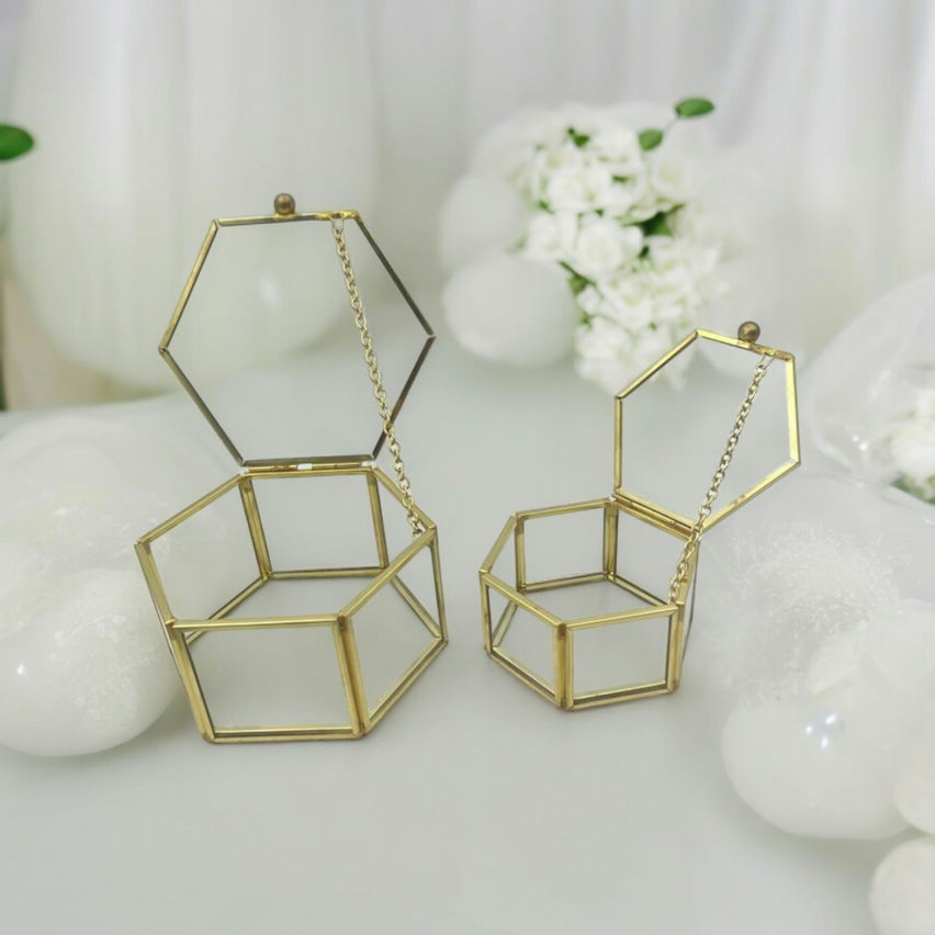 Clear Glass and Brass Hexagonal Trinket Box - Geometric Ring Display Box