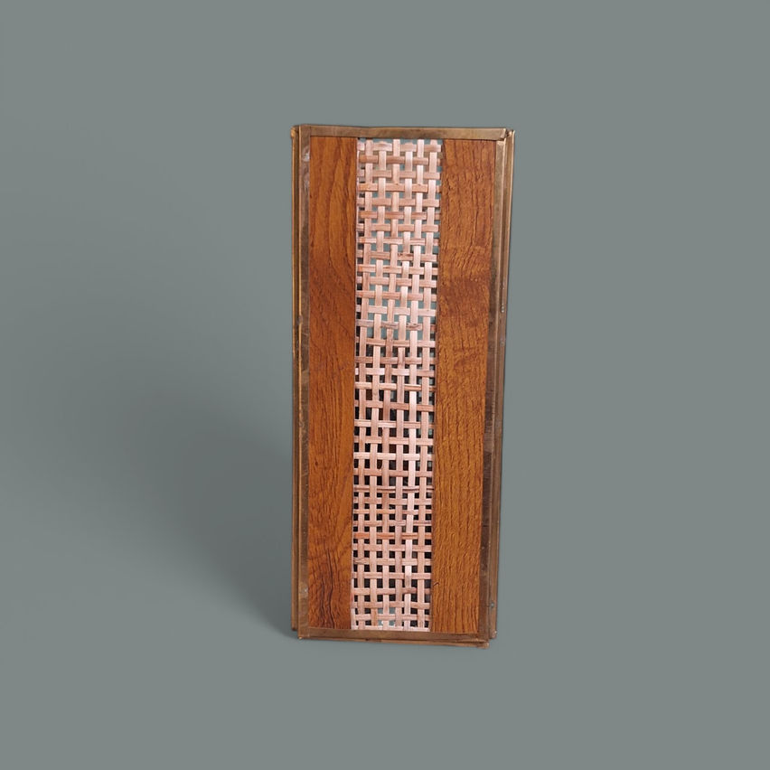 The natural charm of rattan lattice seamlessly blends with the transparency of glass panels, allowing the flickering candlelight to dance through the room. The teak brown mica adds a touch of warmth, enhancing the overall aesthetic. Each piece is adorned with brass details, providing a sophisticated and timeless appeal.