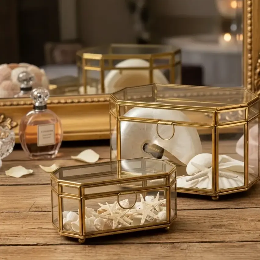 Luxury Crystal-Clear Glazed Glass Keepsake Chest with Gilded Brass Framework