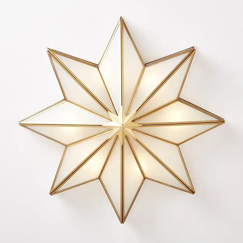 Elevate your living space with our Luxury Frosted Glass Flush Mount Ceiling Light, a perfect blend of elegance and functionality. Made of frosted white glass, this light emits a soft, inviting glow, beautifully complemented by golden brass detailing. Designed with a stunning star-shaped geometric pattern, it adds a touch of sophistication and modern flair to any room. Ideal for anyone seeking to create a warm and stylish ambiance, this ceiling light merges timeless charm with contemporary style. Transform your home decor effortlessly with this exquisite piece!