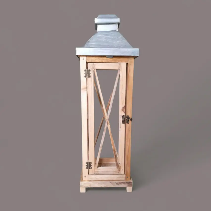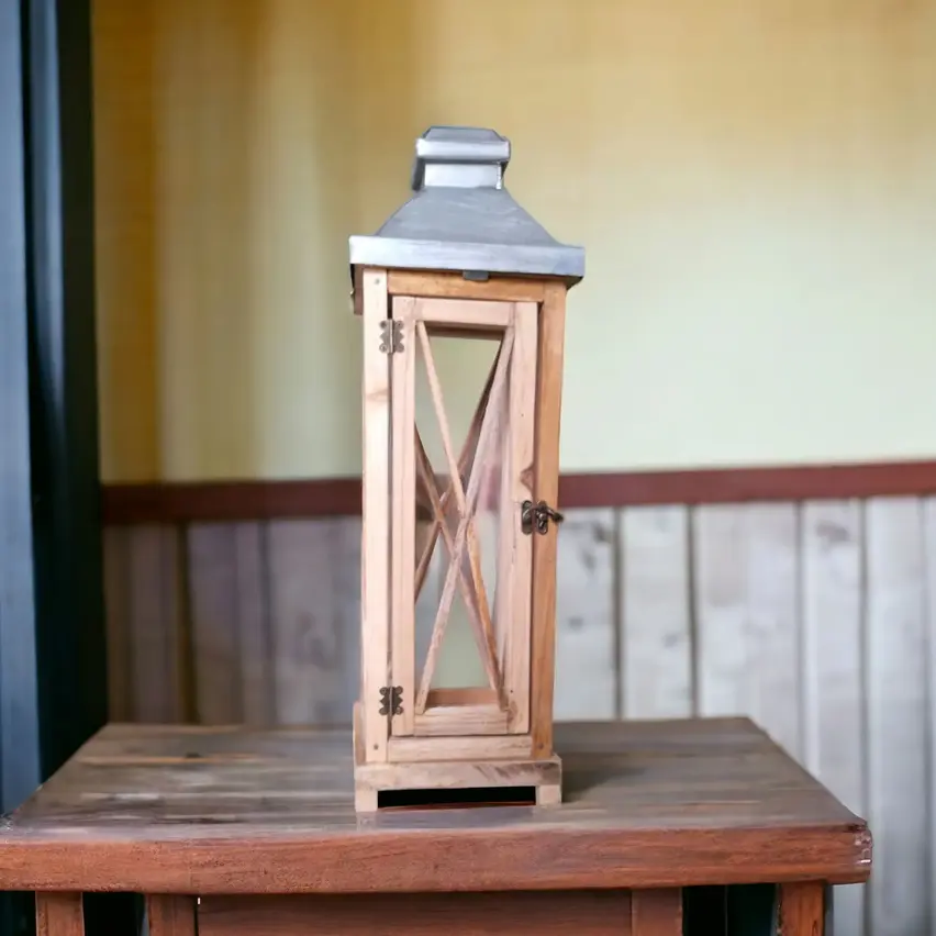 Transform your living space with our Rustic Wooden Lantern with Zinc Metal Top, an exquisite piece designed for aesthetic home lighting. Crafted from high-quality wood and featuring a chic zinc metal top, this lantern brings a touch of rustic charm and modern elegance to any room. Its durable construction and timeless design make it the perfect centerpiece for your coffee table, mantel, or outdoor patio. The warm glow from the lantern adds an inviting ambiance, enhancing the beauty and comfort of your home. Illuminate your life with this stylish and functional home decor piece, where quality meets style.