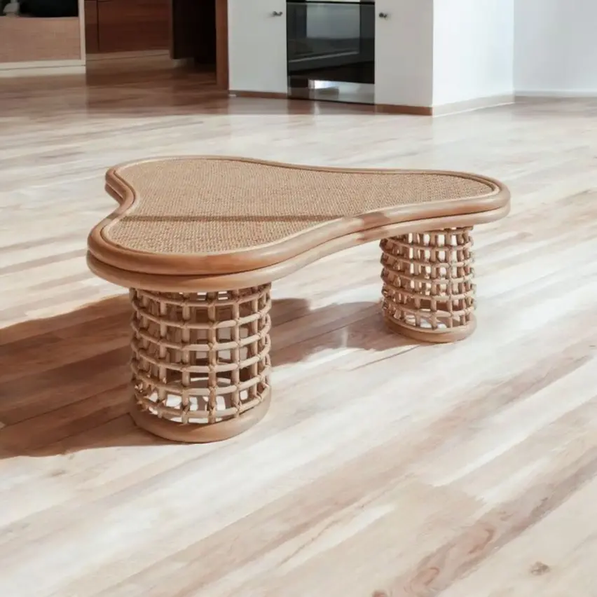 Make a bold, organic statement with the Trillium Shaped Handcrafted Rattan Coffee Table. This exquisite piece draws inspiration from the three-petaled trillium flower, offering a unique "Boho Chic" silhouette that stands out in any interior. The table features a sophisticated hybrid construction: a solid wood top surfaced with a finely woven rattan mat, supported by three architectural, open-weave pillar legs.